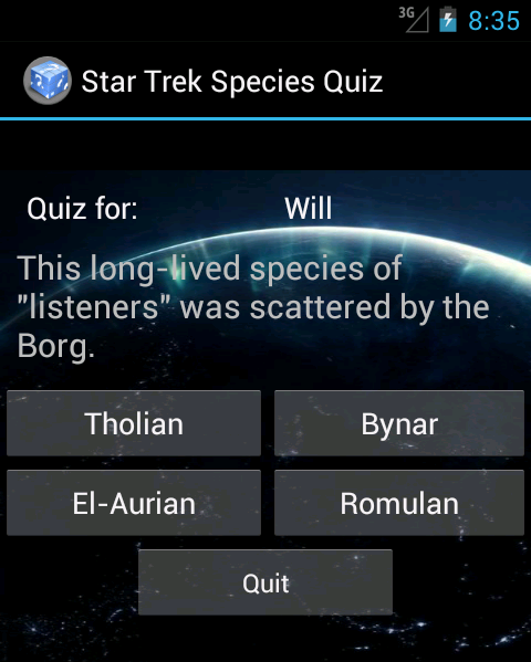 APPD 2000Mobile Application Development60 credit-hoursIn this course we developed simple Android applications using Eclipse. We built layouts, set listeners, passed information with Intents, pulled files from the Asset Manager, and used an application's built-in SQLite database. Testing was typically perfomed in an Android Virtual Device, though students with their own I must acknowledge that layouts were my greatest weakness. I kept trying to make the one layout that would work for every screen size and orientation. Perhaps this was a pig-headed thing to do. I don't think I'm ready to develop Android apps for the real world until I truly master layouts, and I am still a raw beginner even after finishing this course. There were three major deliverables: A calculator, a quiz, and a video player (with ratings). Here I exhibit the quiz: a Star Trek species quiz. (You already have a better calculator, and the video player works off videos already on the SD card and is therefore completely impractical.) Special thanks go to classmate Jamie Curnew for showing me how to use a background.